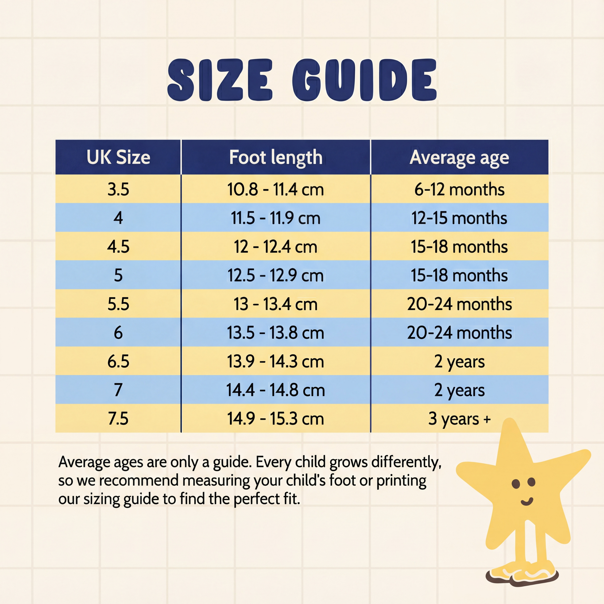 Average ages are only a guide. Every child grows differently, so we recommend measuring your child’s foot or printing our sizing guide to find the perfect fit.